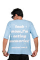 The Ancient One Unisex Terry Oversized Tee in Baby Blue, featuring the phrase "Look Mom, I Am Eating Memories," blends comfort and nostalgia. The quirky design adds a touch of whimsy, making it a unique addition to any wardrobe.
